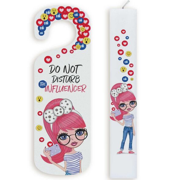 Ένα ολοκληρωμένο εφηβικό πασχαλινό σετ που συνδυάζει λαμπάδα και ξύλινο καδράκι πόρτας με μοντέρνο μήνυμα “Do Not Disturb The Influencer”, ιδανικό για κορίτσια που αγαπούν τα social media και το δικό τους προσωπικό στιλ.