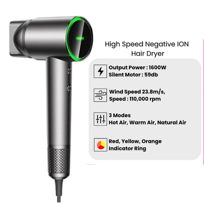 Το Remax Hair Dryer 1600W συνδυάζει υψηλή απόδοση και σύγχρονο σχεδιασμό, προσφέροντάς σας γρήγορο στέγνωμα με επαγγελματικό αποτέλεσμα.