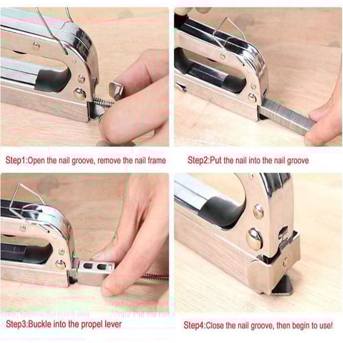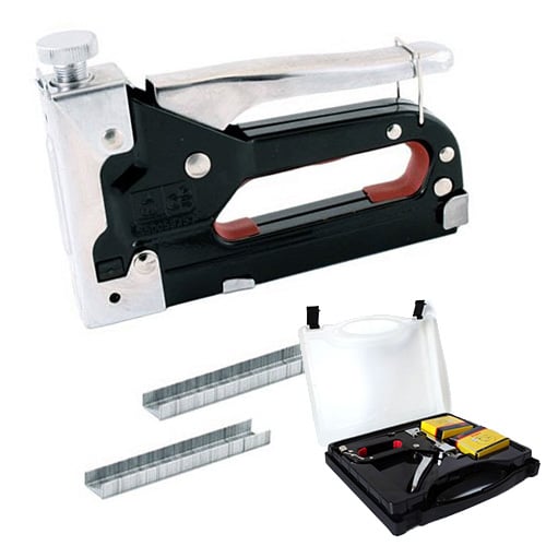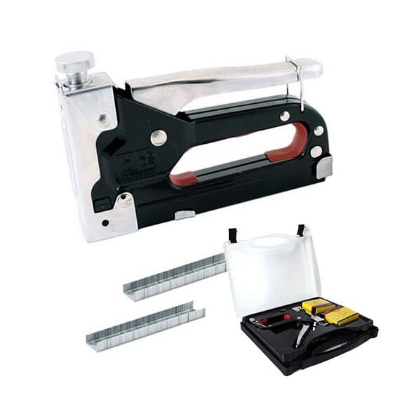 Ένα εργαλείο απαραίτητο για κατασκευές. Στιβαρή κατασκευή από μέταλλο. Ιδανικό για ξύλο. Διαθέτει επίπεδο στόμιο για ευθυγράμμιση. Στην συσκευασία περιλαμβάνονται 2 κουτιά συρραπτικών