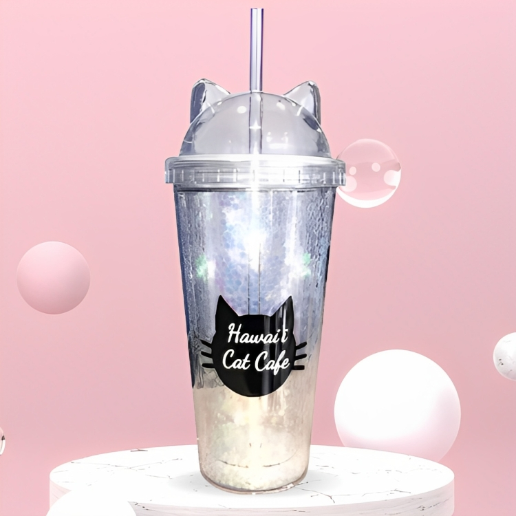 Πλαστικό Ποτήρι με Καπάκι και Καλαμάκι Γάτα - 380 mL - Λιλά