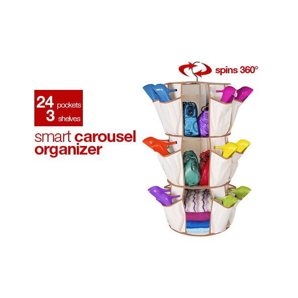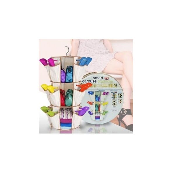 Οργανώστε τα παπούτσια σας και όχι μόνο με το smart carousel organizer. Διαθέτει 24 θήκες για 12 ζεύγη παπούτσια και 3 επίπεδα ράφια για extra αποθηκευτικό χώρο. Περιστρέφεται 360 μοίρες και διπλώνει για εύκολη αποθήκευση.