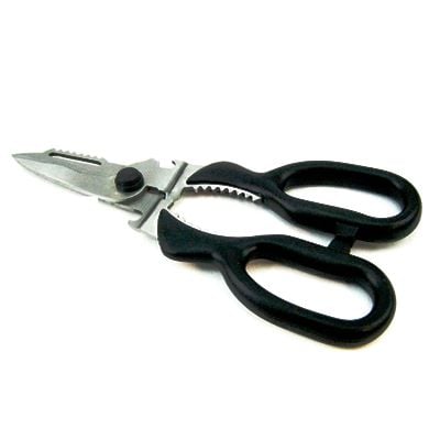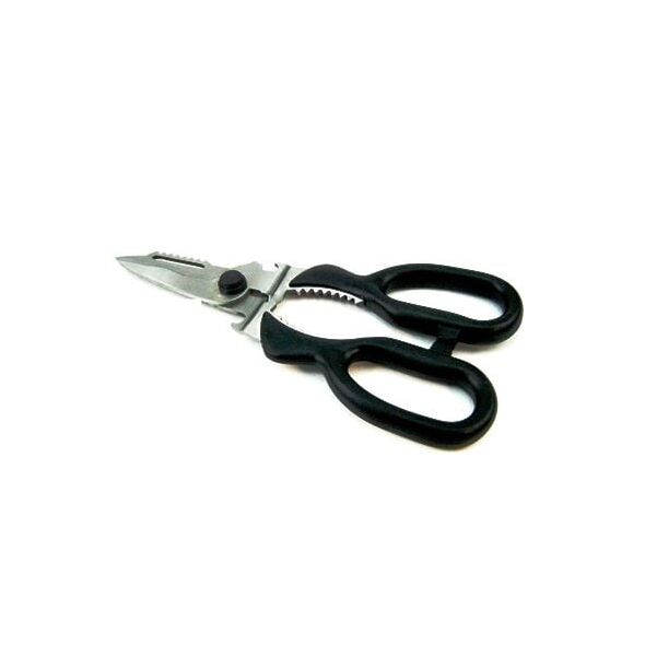 Πολυλειτουργικό ψαλίδι από ανοξείδωτο ατσάλι και λαβή από πολυμερές υλικό.