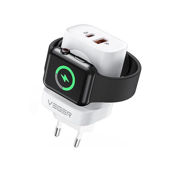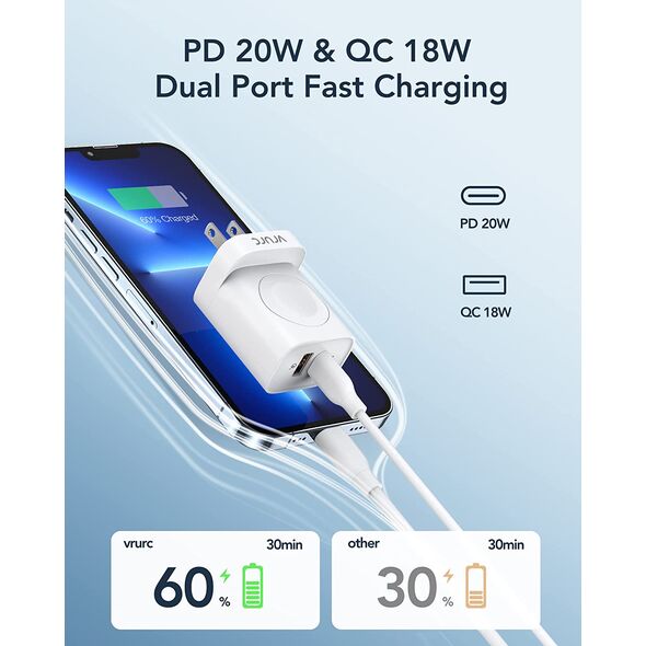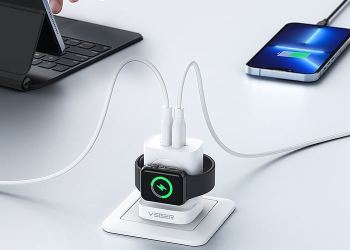Αυτός ο πολυλειτουργικός φορτιστής υποστηρίζει PD3.0+PPS, QC 3.0, την ισχύ της θύρας Type-C έως 20W, η οποία είναι 3 φορές ταχύτερη από τον κανονικό προσαρμογέα 5W. Μπορεί επίσης να παρέχει φόρτιση έκτακτης ανάγκης 20V/1A για MacBook Air. Η θύρα USB-A φτάνει τα 18 W το μέγιστο και η φόρτιση του ρολογιού της Apple αποδίδει ταυτόχρονα στα 2,5 W.