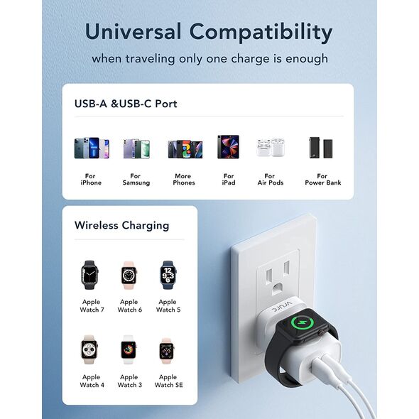 Εξοπλισμένο με ασύρματο φορτιστή USB-C, USB-A και Apple Watch, σας απαλλάσσει από ακατάστατους φορτιστές με διάφορες διεπαφές. Με τις αναδιπλούμενες καρφίτσες και το φορητό μέγεθος, δεν θα πιάσει πολύ χώρο στην τσάντα σας.