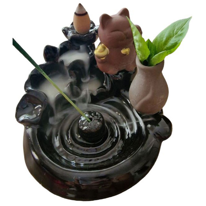 Πορσελάνινη Βάση Αντίστροφης Ροής για Αρωματικά Sticks με Γάτα Καλοτυχίας – Lucky Cat Backflow Incense Holder Μαύρο 12x10 cm