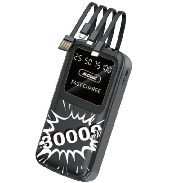 Power Bank 30000mAh με Οθόνη LED, Φακό και Ενσωματωμένα Καλώδια - Andowl