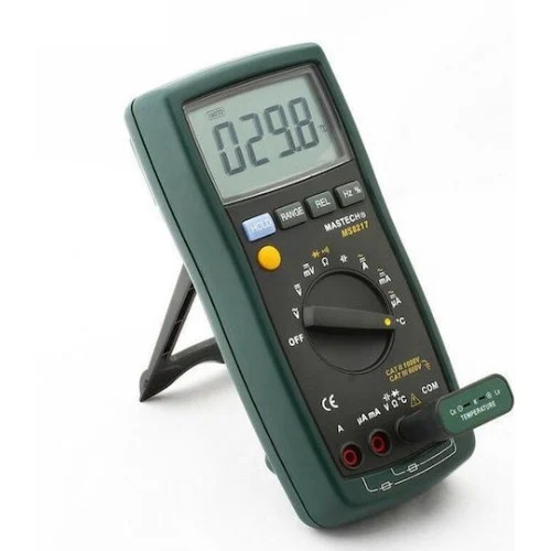 Ψηφιακό πολύμετρο Mastech με αυτόματες κλίμακες, οπίσθιο φωτισμό και πλήρες εύρος μετρήσεων τάσης, έντασης, αντίστασης και θερμοκρασίας. Ιδανικό για τεχνικούς, εργαστήρια και γενική ηλεκτρολογική χρήση.