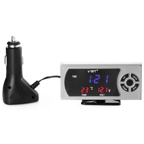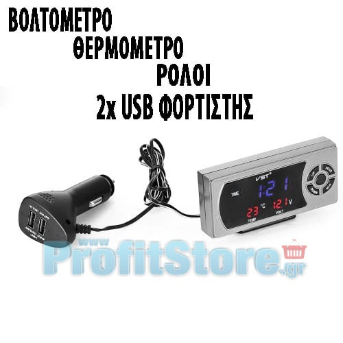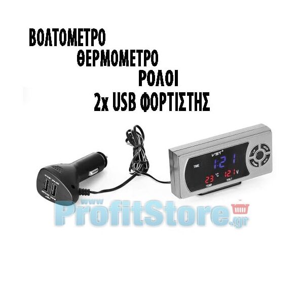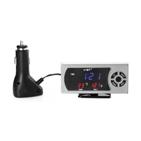 Ψηφιακό πολύμετρο - πολυόργανο με ρολόι αυτοκινήτου, θερμόμετρο και βολτόμετρο. Ελέγξτε την ώρα, τη θερμοκρασία και την μπαταρία σας με μια ματιά! Λειτουργεί συνδέοντας το στον αναπτήρα του αυτοκινήτου με τον ειδικό αντάπτορα που παράλληλα διαθέτει και 2 USB θύρες φόρτισης. Απεικονίζει τα δεδομένα σε οθόνη LED, ορατή από όλες τις γωνίες.