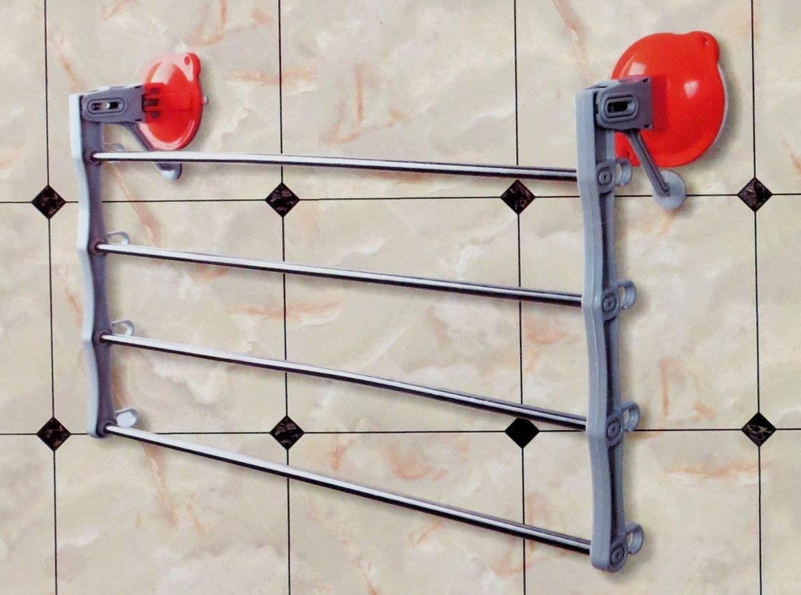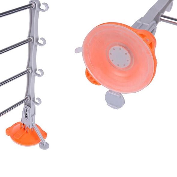 - Μία πτυσσόμενη πλαστική απλώστρα για τις πετσέτες του μπάνιου σας με όμορφο design σε γκρι χρώμα με πορτοκαλί βεντούζες.