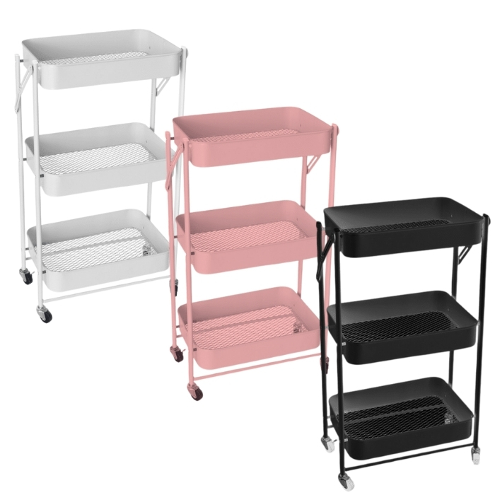 Η τροχήλατη ραφιέρα τριών επιπέδων προσφέρει πρακτική οργάνωση σε κάθε χώρο, χάρη στη σταθερή μεταλλική κατασκευή και τον πτυσσόμενο σχεδιασμό της.