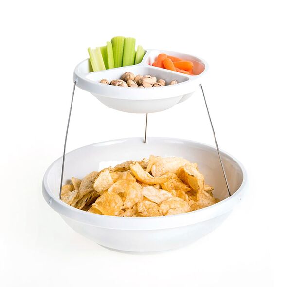 Πτυσσόμενο μπολ 2 επιπέδων ιδανικό για πάρτυ! Σας προσφέρει εξοικονόμηση χώρου εφόσον τα δύο μπολ μαζεύουν και απλώνουν με μία μόνο συστροφή. Τα μπολ διαθέτουν κρυφούς μαγνήτες ώστε να μένουν ενωμένα όταν μαζεύουν. Το μικρότερο μπολ διαθέτει 3 θήκες, κατάλληλες για μικρά σνακ όπως ξηροί καρποί!