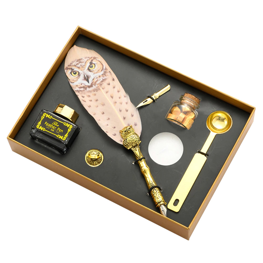 Ρετρό Σετ Πένα Καλλιγραφίας με Φτερό Κουκουβάγιας & Σφραγίδα Διπλής Χρήσης με Κερί - Vintage Dipping Feather Pen