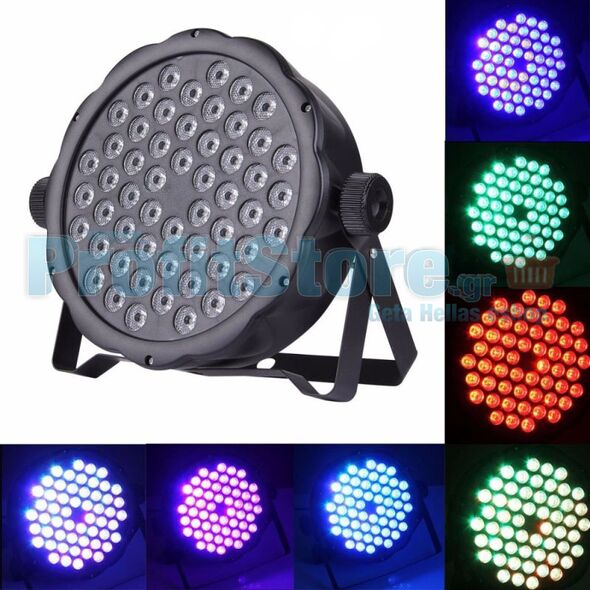 Ημι-Επαγγελματικός προβολέας LED RGB ο οποίος σε συνδυασμό με κονσόλα φωτισμού μπορεί να αποδώσει οποιοδήποτε απόχρωση RGB. Διαθέτει λειτουργίες stand alone (έτοιμα προγράμματα) και music control (δυνατότητα συγχρονισμού με την μουσική). Πολύ υψηλής φωτεινότητας. Λειτουργίες Dimmer, strobe effects. Όλες οι ρυθμίσεις γίνονται μέσω LCD display οθόνη.