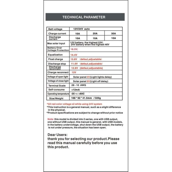 Ψηφιακός ρυθμιστής φόρτισης για φωτοβολταϊκά panel. Κατάλληλος για φωτοβολταϊκά συστήματα 12V/24V ισχύος 10A. Διαθέτει επίσης ευανάγνωστη LCD οθόνη για εύκολη απεικόνιση όλων των ενδείξεων του συστήματός σας. Αυτόματη αναγνώριση τάσης συστήματος. Είναι κατάλληλος για μπαταρίες OPEN,AGM, GEL.