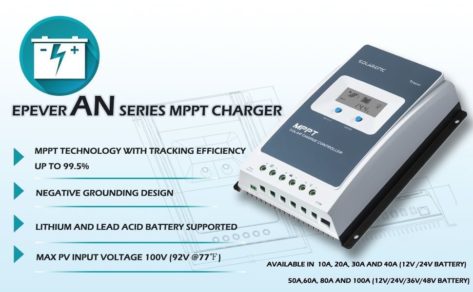 Ο ρυθμιστής φόρτισης της Epever για αυτόνομα φωτοβολταϊκά συστήματα 12V/24V διαθέτει τον έξυπνο αλγόριθμο ανίχνευσης μέγιστου σημείου ισχύος MPPT μεγιστοποιώντας έτσι την απόδοση κατά 30%. Διαθέτει επίσης ευανάγνωστη LCD οθόνη για εύκολη απεικόνιση όλων των ενδείξεων του συστήματός σας. Μέγιστη τάση φωτοβολταϊκού 100V.