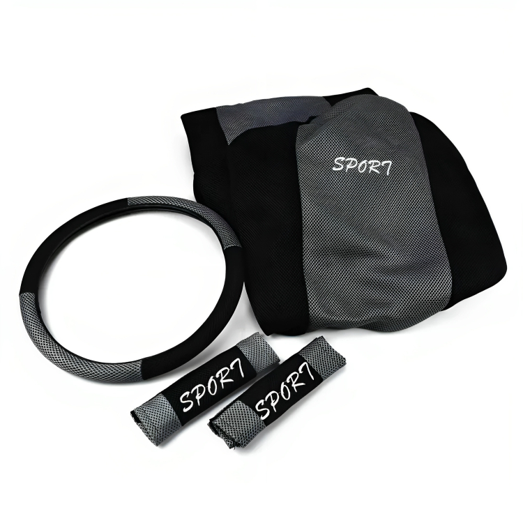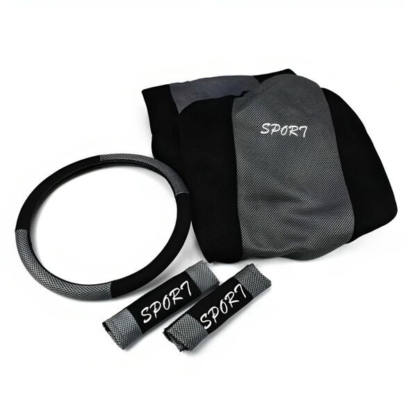Σετ 6 τμχ Sport Υφασμάτινα Καλύμματα Αυτοκινήτου Καθισμάτων, Τιμονιού & Ζώνης Μαύρο / Γκρι