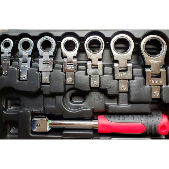 Αυτό το σετ περιλαμβάνει οκτώ κλειδιά με σπαστή κεφαλή πολυγώνου και ενσωματωμένο μηχανισμό καστάνιας, επιτρέποντας τη χρήση υπό οποιαδήποτε γωνία και διευκολύνοντας την πρόσβαση σε δυσπρόσιτα σημεία.