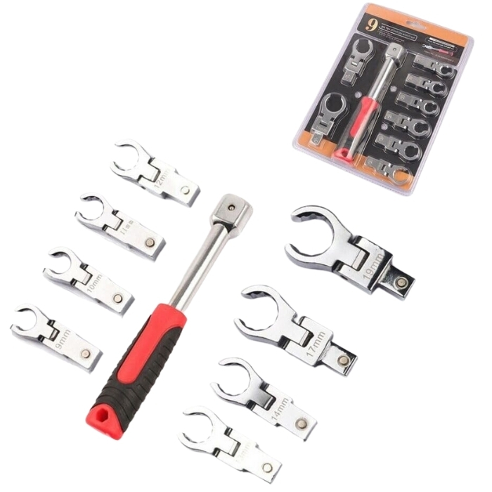 Το σετ των 9 τεμαχίων περιλαμβάνει σπαστά γερμανοπολύγωνα κλειδιά με ανοιχτό τύπο, σχεδιασμένα για απόλυτη ακρίβεια και άνεση σε δύσκολες θέσεις.