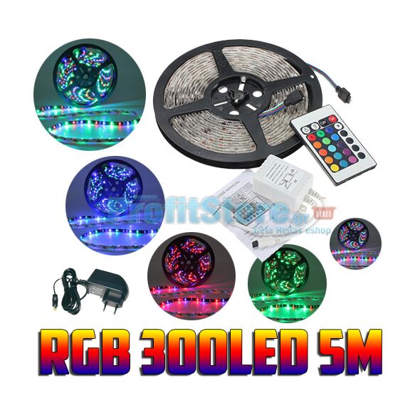 Πλήρες Σετ 5 μέτρων LED RGB Αδιάβροχης Αυτοκόλλητης Ταινίας 54SMD 4,8W/m 12V με τροφοδοτικό, controller και τηλεκοντρόλ.