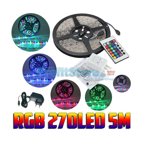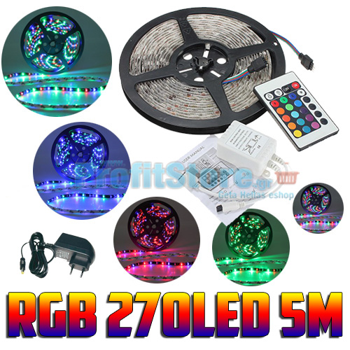 Πλήρες Σετ 5 μέτρων LED RGB Αδιάβροχης Αυτοκόλλητης Ταινίας 54SMD 12V Super Bright με τροφοδοτικό, controller και τηλεκοντρόλ.
