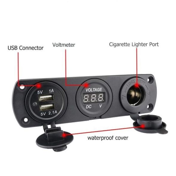 - 1 x Σετ Αδιάβροχο 3 σε 1 Πάνελ Οργάνων Φόρτισης - Ψηφιακό Βολτόμετρο & Αντάπτορας Αναπτήρα με 2 Θύρες USB Γρήγορης Φόρτισης