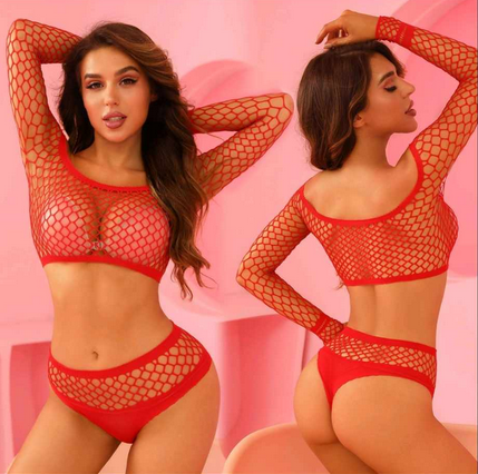 Σετ Αισθησιακό Γυναικείο Διχτυωτό Μπικίνι - Εσώρουχο με See Through Μακρυμάνικο Τοπ Sexy One Size Ελαστικό Κόκκινο
