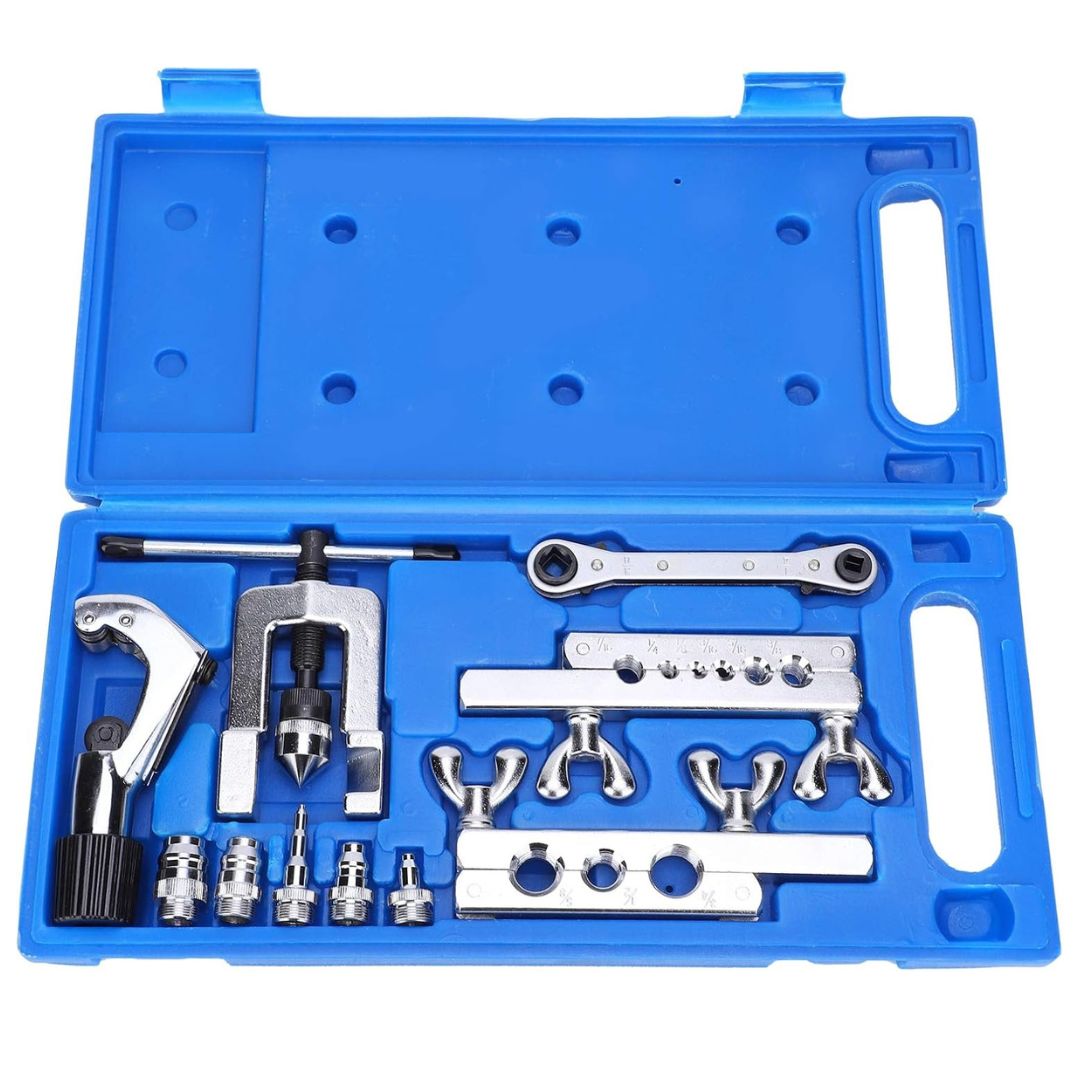 ✅ Κατασκευασμένο από ανθεκτικό χάλυβα και αλουμίνιο υψηλής αντοχής, περιλαμβάνει όλα τα απαραίτητα εργαλεία για τη δημιουργία φλάντζας 45°, τη διεύρυνση και την ακριβή προσαρμογή σωλήνων διαφορετικών διαμέτρων.