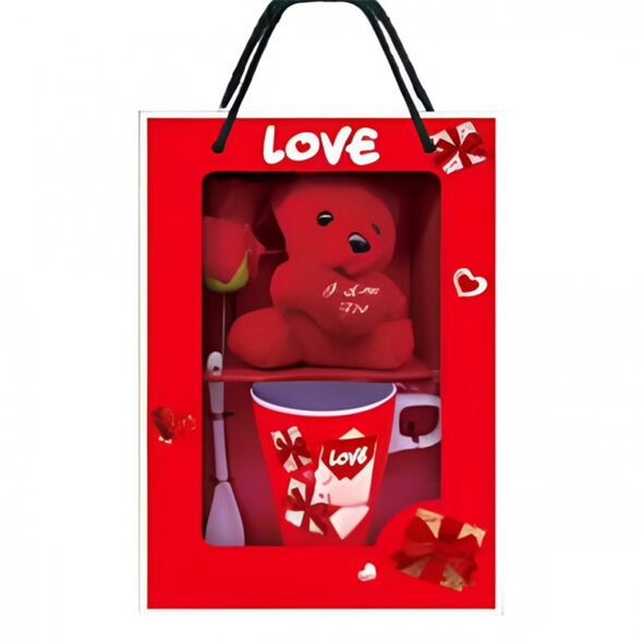 Το σετ δώρου Love συνδυάζει μια κόκκινη κούπα με σχέδια καρδιών, ένα μαλακό αρκουδάκι και ένα τεχνητό κόκκινο τριαντάφυλλο, δημιουργώντας μια ολοκληρωμένη και τρυφερή πρόταση δώρου.