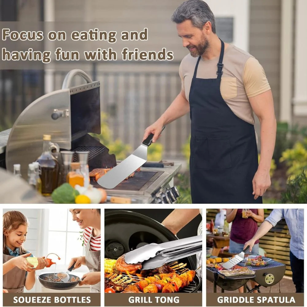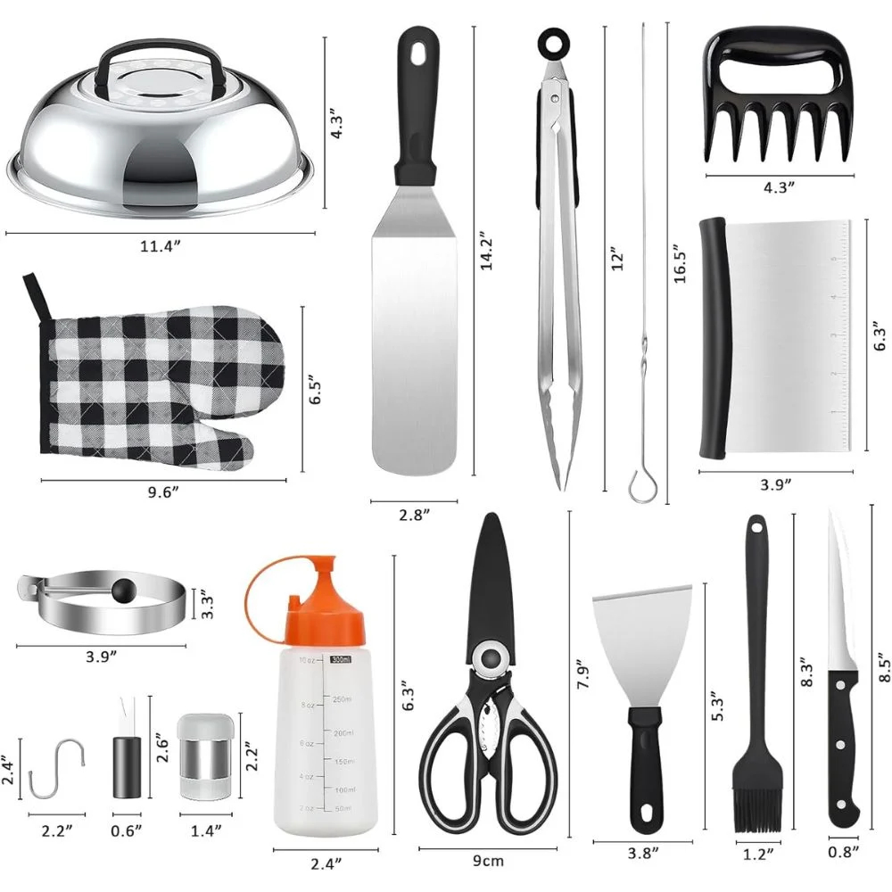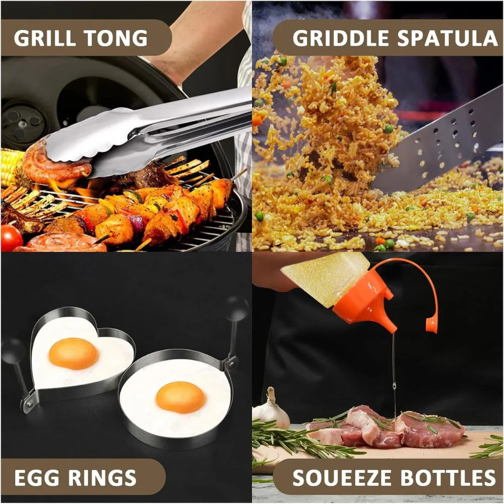 Το σετ περιλαμβάνει πένσα, σπάτουλες, ψαλίδι, πινέλο, δαχτυλίδια αυγών, σφιγκτήρες, μπουκαλάκια λαδιού και πολλά ακόμη αξεσουάρ για ολοκληρωμένη εμπειρία BBQ.