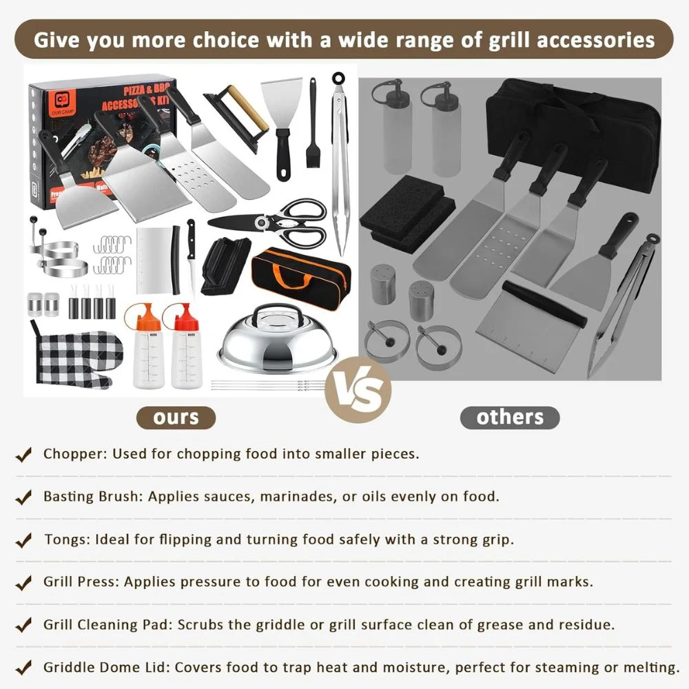 - Περιλαμβάνονται: Σπάτουλες, πένσα, ψαλίδι, μαχαίρι, πινέλο, δαχτυλίδια αυγών, σφιγκτήρες, θόλος ατμού, γάντι, καθαριστικό εργαλείο, δοχεία σάλτσας/λαδιού, και θήκη μεταφοράς