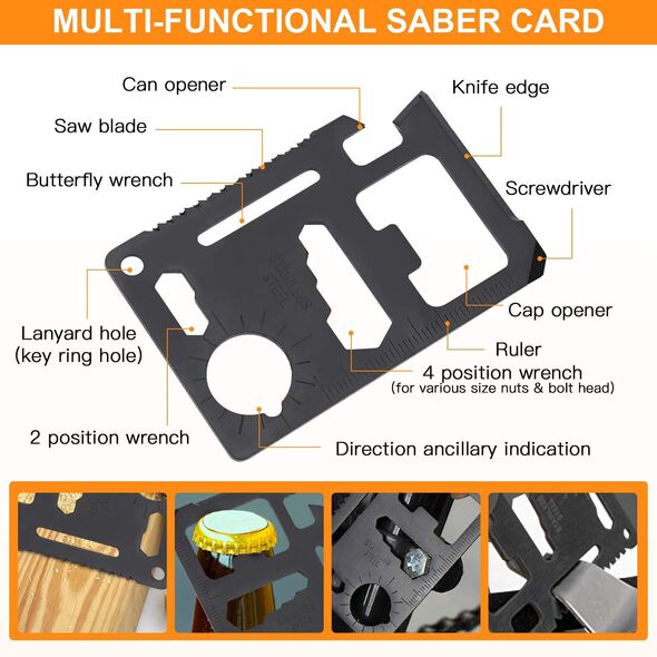 1. Πολυεργαλείο στο μέγεθος κάρτας με χάρακα, ανοιχτήρι, ανοιχτήρι για κονσέρβες, γαλλικό κλειδί 6mm, 7mm, 8mm, 10mm, μαχαίρι - κοπίδι, ίσιο κατσαβίδι, πριονάκι, butterfly wrench, μοιρογνωμόνιο, τρύπα για στερέωση κορδονιού ή δακτυλίου με κλειδιά