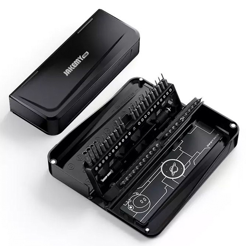 Σετ κατσαβιδιών της Jakemy το οποίο αποτελείται από κατσαβίδι, προέκταση, μαγνητικό φύλλο και 44 διαφορετικές μύτες κατσαβιδιού.
