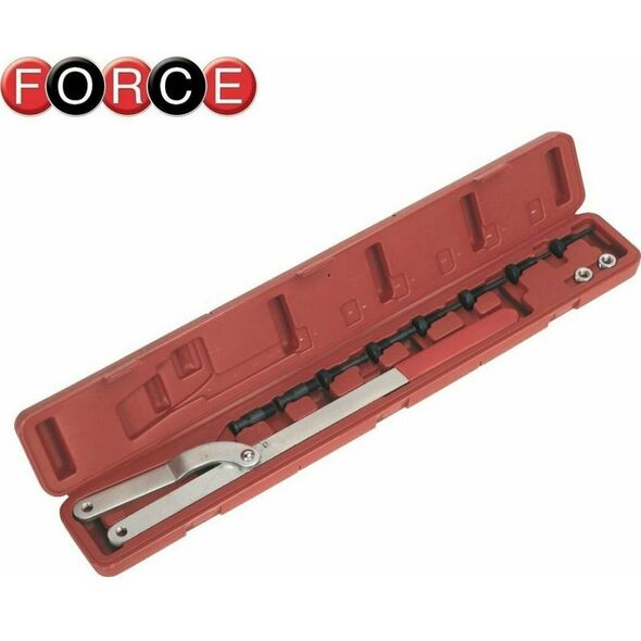 Το σετ περιλαμβάνει ρυθμιζόμενο κλειδί με εύρος από 40mm έως 220mm, καθώς και ζεύγη εναλλάξιμων ακίδων διαφορετικών διατομών, εξασφαλίζοντας μέγιστη συμβατότητα με διάφορους τύπους τροχαλιών.
