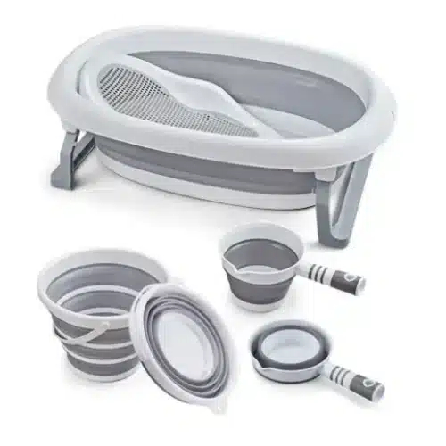 Αυτό το σετ περιλαμβάνει μια πτυσσόμενη μπανιέρα, σχεδιασμένη για εύκολη αποθήκευση και μεταφορά, ιδανική για μικρούς χώρους ή ταξίδια.