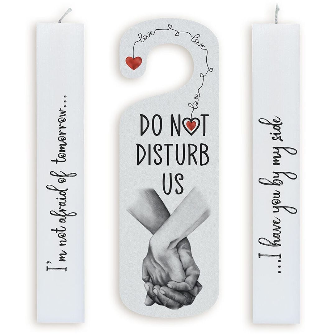 Επιλέξτε ένα πρωτότυπο πασχαλινό σετ για ζευγάρια, που συνδυάζει δύο λευκές λαμπάδες με εκτύπωση και ένα ξύλινο καδράκι πόρτας με το μήνυμα “Do Not Disturb Us”, διακοσμημένο με ρομαντικές λεπτομέρειες και καρδιές σε κόκκινη απόχρωση.