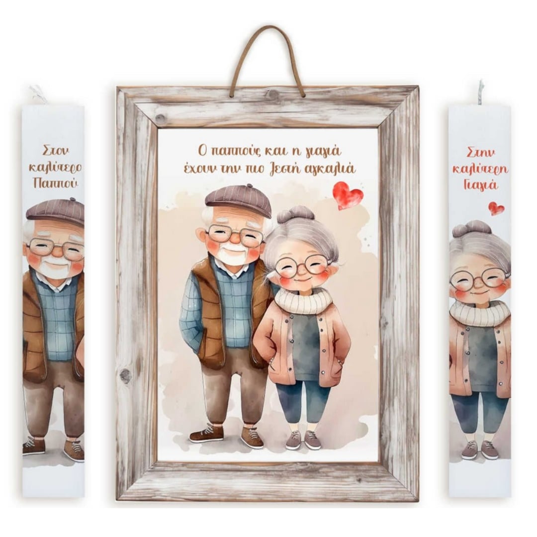 Ένα τρυφερό πασχαλινό σετ που συνδυάζει ζευγάρι λαμπάδων με εκτύπωση για Γιαγιά και Παππού και ένα όμορφο ξύλινο καδράκι με εικονογράφηση και συγκινητικό μήνυμα.