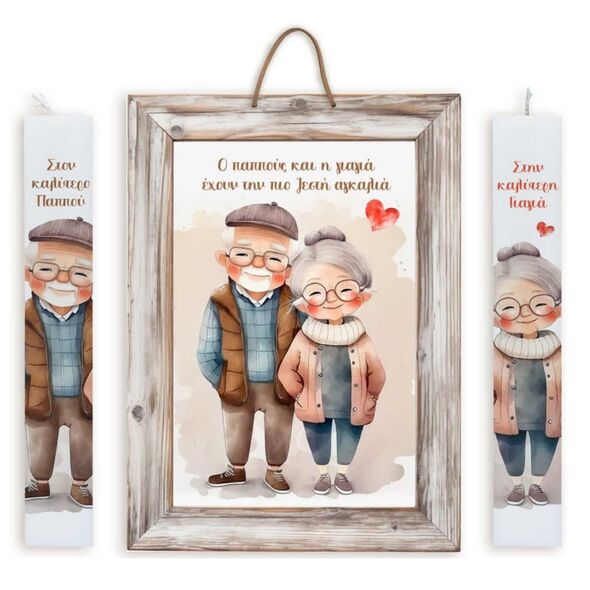 Σετ Ζευγάρι Λαμπάδες Γιαγιά - Παππούς με Εκτύπωση Υψηλής Ποιότητας & Ξύλινο Αναμνηστικό Καδράκι