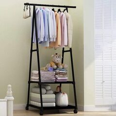Κρεμάστρα - Βεστιάριο δαπέδου με ραφιέρα και παπουτσοθήκη κατασκευασμένη από μέταλλο. Διαθέτει ροδάκια για εύκολη μετακίνηση από δωμάτιο σε δωμάτιο, καθώς και 2 ραφάκια όπου μπορείτε να βάλετε παπούτσια, τσάντες ή άλλα είδη ένδυσης.