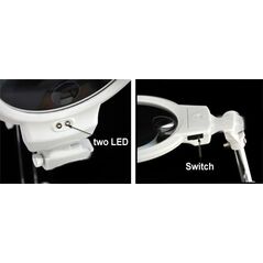Επιτραπέζιος μεγεθυντικός φακός με μεγάλο φακό 13cm δυνατό φωτισμό LED και μεγέθυνση x2. Μπορεί να κρατηθεί στο χέρι ή να στερεωθεί για επιτραπέζια χρήση. Ιδανικός για διάβασμα, παρατήρηση αντικειμένων, μοντελισμό και εργασίες που απαιτούν ακρίβεια. Βάση με χάρακα και μετρήσεις σε εκατοστά και ίντσες.