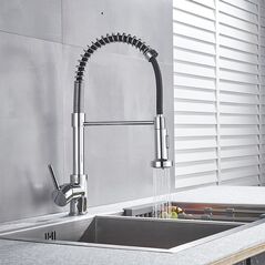 Μπαταρία κουζίνας με αποσπώμενο ντουζ με αυτόματη επαναφορά. Συνδέεται με φίλτρο νερού και μπορεί να τοποθετηθεί είτε στον πάγκο της κουζίνας, είτε απευθείας στον νεροχύτη.