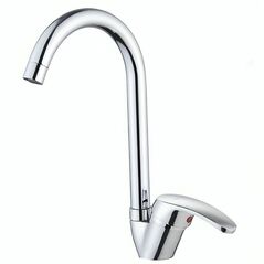 Κομψή μπαταρία κουζίνας πάγκου σε χρωμέ, με αναμεικτικό μηχανισμό και ψηλό ρουξούνι για ευκολία στον καθαρισμό και αντοχή στην καθημερινή χρήση – ιδανική για κάθε κουζίνα.