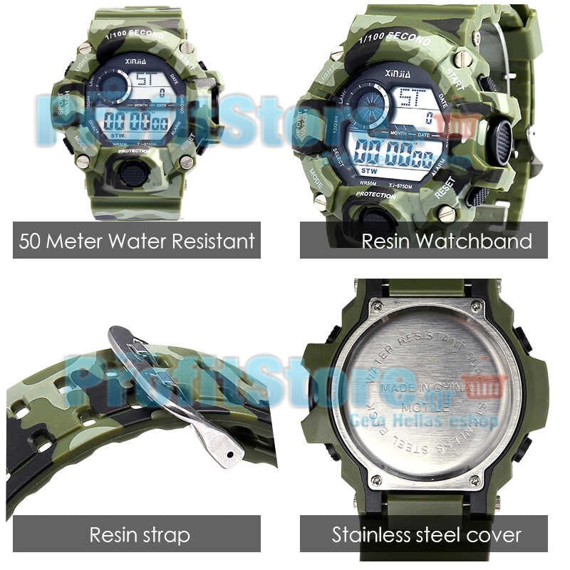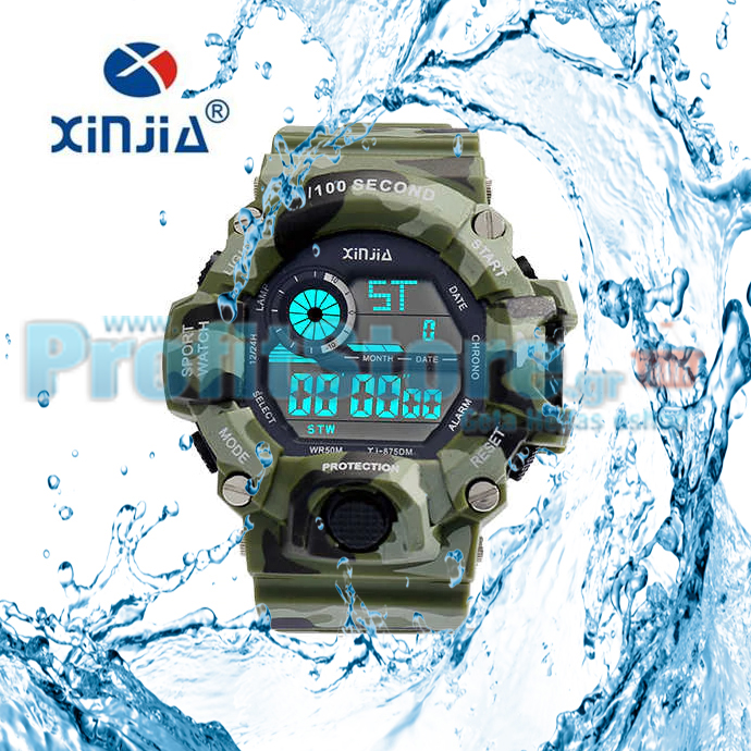 Εντυπωσιακός ψηφιακός χρονογράφος της Xinjiai. Σπορ, αδιάβροχος, σε 2 όμορφα camouflage χρώματα για κάθε γούστο. Φωτιζόμενος με ένδειξη ώρας, χρονόμετρο, 50m αδιάβροχο (5 ATM) και φυσικά με πλήρες αυτόματο ημερολόγιο, ένδειξη ημέρας, ημερομηνίας και ξυπνητήρι.