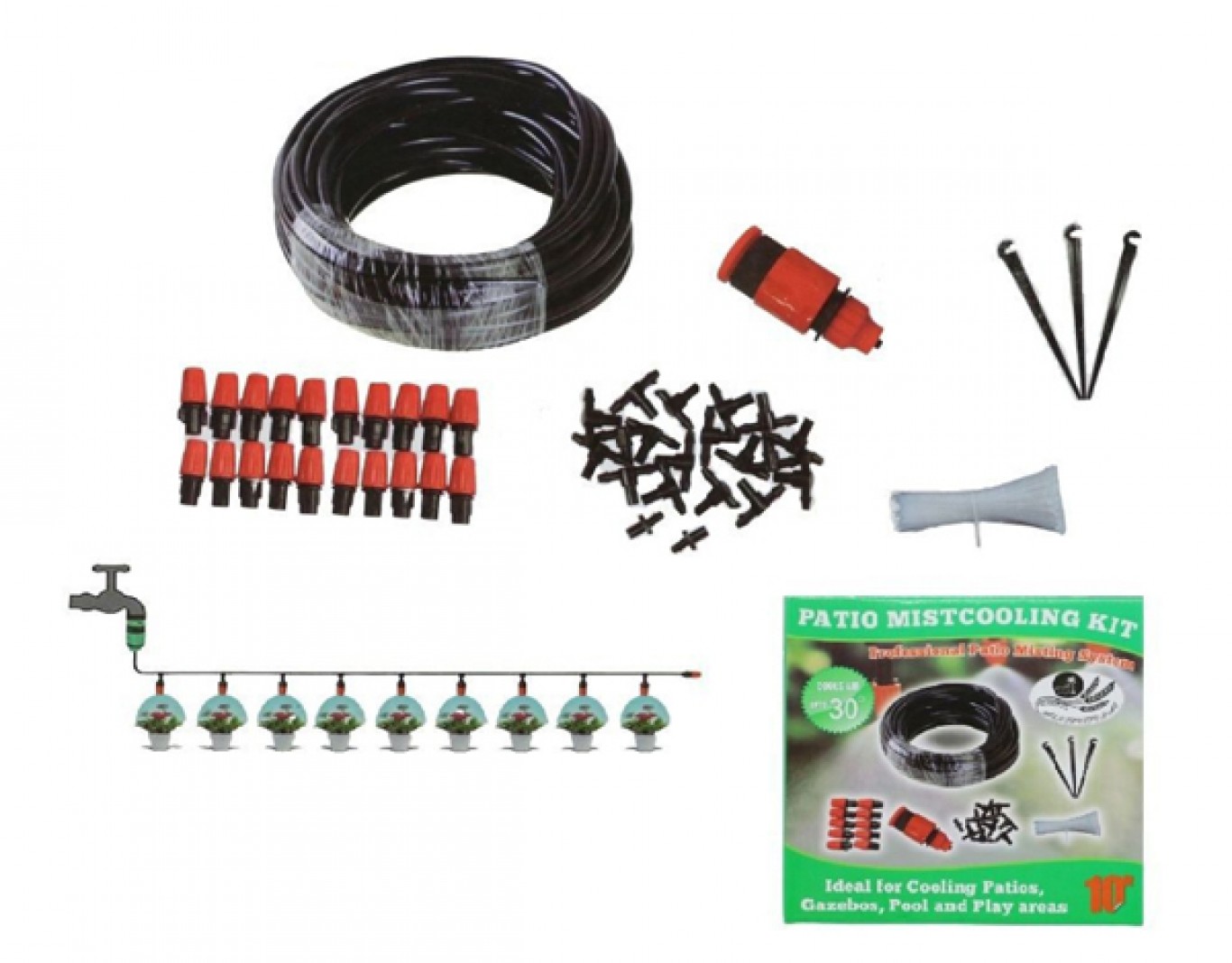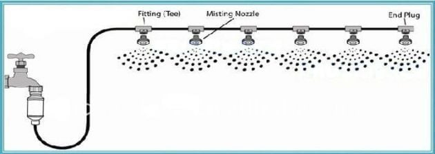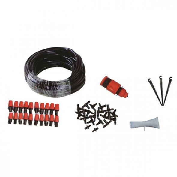 Πλήρες σύστημα υδρονέφωσης για εξωτερικούς χώρους με 20 ακροφύσια (πλαστικά μπεκ) και λάστιχο μήκους 20m.