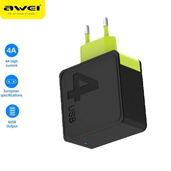 Τετραπλός Φορτιστής Πρίζας 100-240V με 4x USB Θύρες 4.0A Γρήγορης Φόρτισης - Αντάπτορας Τοίχου AWEI - Μαύρο, Πράσινο