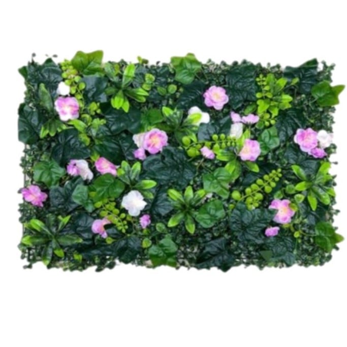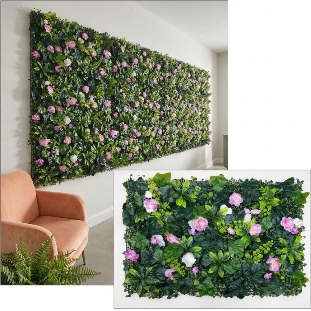 Δώστε στον χώρο σας μια φυσική και κομψή αισθητική με το τεχνητό διακοσμητικό πάνελ φυλλωσιάς, το οποίο συνδυάζει πλούσιο πράσινο φύλλωμα με διακριτικές ροζ ανθισμένες λεπτομέρειες.