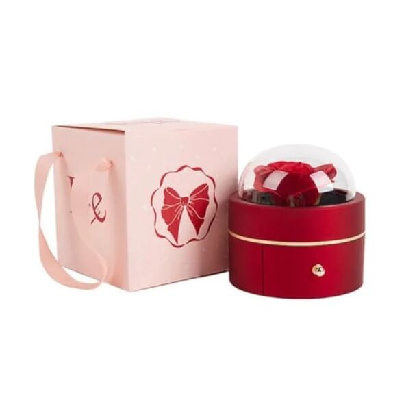 Το εσωτερικό αποκαλύπτει ένα τεχνητό τριαντάφυλλο εξαιρετικής ποιότητας, προστατευμένο μέσα σε διαφανή θόλο που ενισχύει την τρισδιάστατη αίσθηση και την αίσθηση “μουσειακού” εκθέματος.
