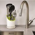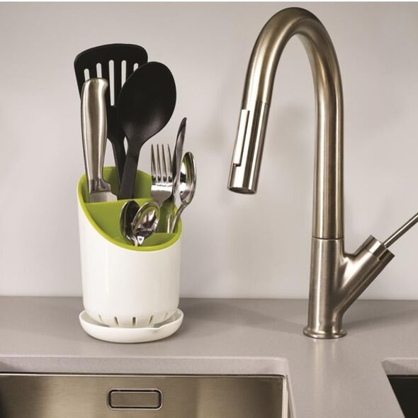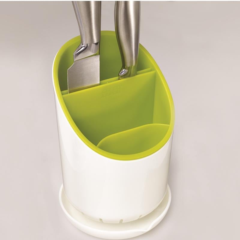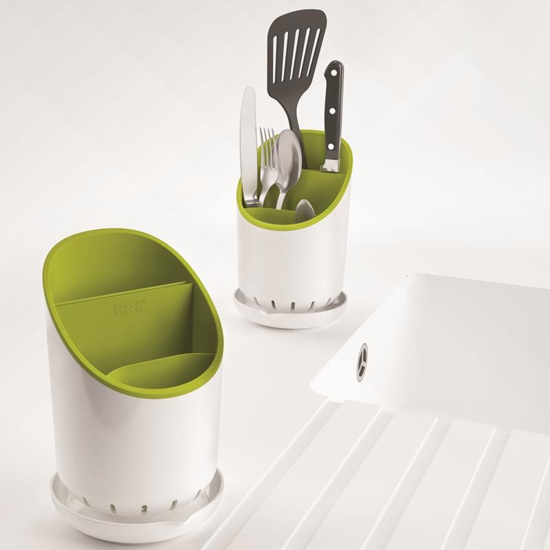 Το έξυπνο αυτό στραγγιστήρι οργανώνει τα σκεύη μας, ενώ διαθέτει ειδική θήκη για τα μαχαίρια για να προστατεύει τα χέρια μας από ατυχήματα και αποσπώμενο κάδο αποστράγγισης.