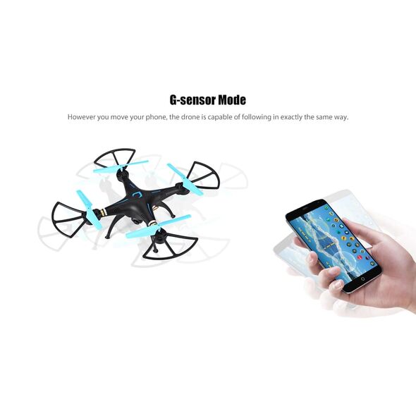 Αυτό το Drone διαθέτει τεχνολογία G-Sensor. Πιο αναλυτικά, μπορείτε να το χειριστείτε μέσω του κινητού σας και να το τηλεκατευθείνετε αναλόγως με την κλίση που δίνετε στο κινητό σας! Βέβαια σας δίνεται και η δυνατότητα να το χειριστείτε και μέσω του εικονικού τηλεχειριστηρίου που παρέχει η εφαρμογή στο κινητό ή και από κανονικό τηλεχειριστήριο που συνοδεύει το Drone!