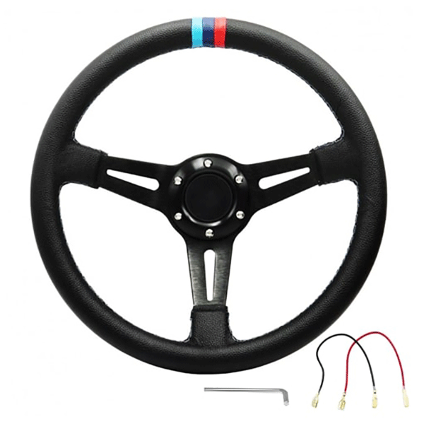 Είναι κατασκευασμένο από εντυπωσιακό αλουμίνιο και μαλακή δερματίνη για ασφαλές και άνετο κράτημα,τύπου BMW με 3 λωρίδες μπλε-κόκκινο-γαλάζιο δίνοντας ταυτόχρονα ένα μοναδικό αισθητικό αποτέλεσμα στο εσωτερικό του αυτοκινήτου σας.