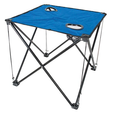 Μικρό πτυσσόμενο τραπέζι μεταλλικό με υφασμάτινη επιφάνεια για εύκολη χρήση. Διαθέτει επίσης και υποδοχείς για ποτηράκια.